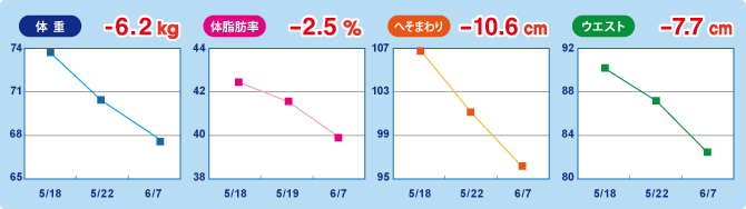 体重が落ちない時も、モチベーションを保つことができたし、帰ってからの食事の摂り方や出来る運動など一緒に話をしたり、提案してくださいました。いつも、これからのことを考えてくださいました。